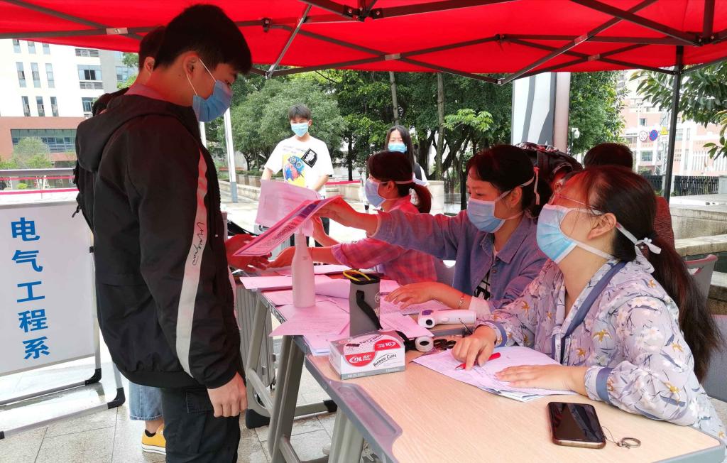 上午8点,身披志愿服务绶带的青年志愿者早已悄然上岗,他们有一个共同的名字--“返校复学青年突击队”。这是一支由高职入党积极分子组成的志愿者队伍,主要负责为同学们搬运行李、测量体温、核对信息、核验健康码、维护返校秩序……他们轮班上岗,连续工作数个小时早已司空见惯,中午甚至连吃饭的时间都没有。